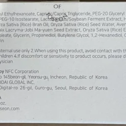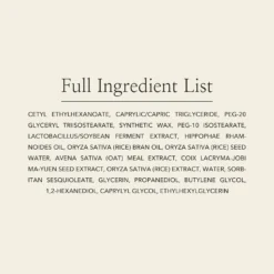 Cetyl Ethylhexanoate, Caprylic/Capric Triglyceride, PEG-20 Glyceryl Triisostearate, Synthetic Wax, PEG-10 Isostearate, Lactobacillus/Soybean Ferment Extract, Hippophae Rhamnoides Oil, Oryza Sativa (Rice) Bran Oil, Oryza Sativa (Rice) Seed Water, Avena Sativa (Oat) Meal Extract, Coix Lacryma-Jobi Ma-yuen Seed Extract, Oryza Sativa (Rice) Extract, Water, Sorbitan Sesquioleate, Glycerin, Propanediol, Butylene Glycol, 1,2-Hexanediol, Caprylyl Glycol, Ethylhexylglycerin