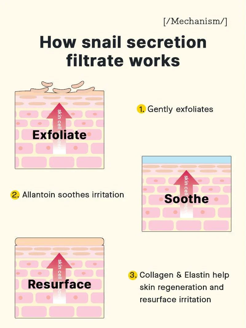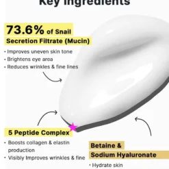 Snail Secretion Filtrate, Butylene Glycol, Glycerin, Helianthus Annuus (Sunflower) Seed Oil, 1,2 Hexanediol, Niacinamide, Water, Palmitic Acid, Arginine, Carbomer, Stearic Acid, Betaine, Cetearyl Olivate, Sorbitan Olivate, Sodium Polyacrylate, Allantoin, Tocopheryl Acetate, Panthenol, Hydroxyethyl Acrylate/Sodium Acryloyldimethyl Taurate Copolymer, Sodium Hyaluronate, Adenosine, Xanthan Gum, Myristic Acid, Copper Tripeptide 1, Acetyl Hexapeptide 8, Palmitoyl Pentapeptide 4, Palmitoyl Tripeptide 1, Palmitoyl Tetrapeptide 7.