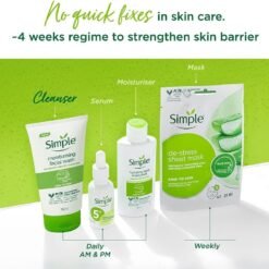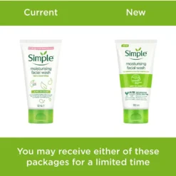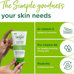 When your skin’s healthy and happy and fresh faced, you feel healthier and happier too. Simple’s moisturising facial wash is an ideal blend of ingredients to keep skin thoroughly cleansed and nourished. Ideal for even sensitive skin. How to get good results In your hands, work a small amount into a lather. Massage onto wet skin, rinse with water. If wash gets into your eyes rinse thoroughly with water. simple logo Simple Goodness: Simple’s special blend of Simple moisturising goodness containing pro-vitamin B5, vitamin E and bisabolol, helps to moisturise and soften the skin. Simple Sense – four steps to healthy, happy skin Healthy skin is crucial for providing the right canvas for applying make-up, to enhance natural beauty and create natural healthy looking skin. Having a good daily skincare routine can dramatically improve the look and feel of our skin. Just a few steps each day will take tired, dull, unhealthy skin to bright, fresh and happy in no time.
