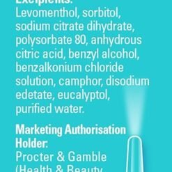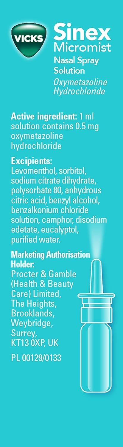 Active Ingredient: Oxymetazoline HCl 0.05% w/v. Other Ingredients: Levomenthol, Sodium Citrate Dihydrate, Tyloxapol, Citric Acid Anhydrous, Chlorhexidine Digluconate Solution, Benzalkonium Chloride Solution, Camphor, Disodium Edetate Dihydrate, Eucalyptol, Sodium Hydroxide and Purified Water